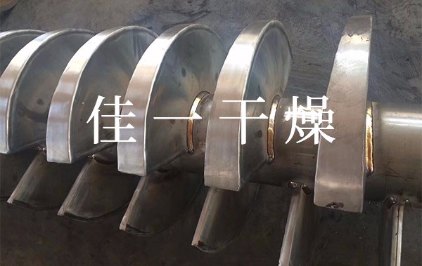空心軸上密集排列著楔型中空漿葉,熱介質(zhì)經(jīng)空心軸流經(jīng)漿葉。單位有效容積內(nèi)傳熱面積很大,熱介質(zhì)溫度從-40℃到320℃,可以是水蒸汽,也可以是液體型:如熱水、導(dǎo)熱油等。間接傳導(dǎo)加熱,沒有攜帶空氣帶走熱量,熱量均用來加熱物料。熱量損失僅為通過器體保溫層向環(huán)境的散熱。楔型漿葉傳熱面具有自清潔功能。物料顆粒與楔型面的相對(duì)運(yùn)動(dòng)產(chǎn)生洗刷作用,能夠洗刷掉楔型面上附著物料,使運(yùn)轉(zhuǎn)中一直保持著清潔的傳熱面。漿葉干燥機(jī)的殼體為Ω型,殼體內(nèi)一般安排二到四根空心攪拌軸。殼體有密封端蓋與上蓋,防止物料粉塵外泄而充分發(fā)揮作用。